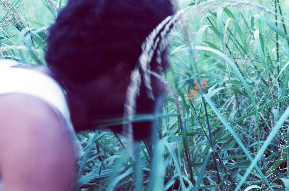 Image description: a medium close up picture of the artist, JJJJJerome Ellis, in a green field, leaning towards a single orange flower. The picture's focus is on the flower, the artist's face remains off-focus.