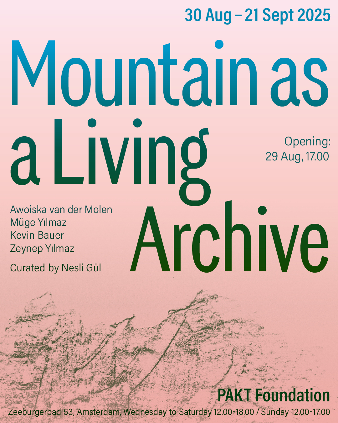 The finissage features a conversation with Awoiska van der Molen (artist & photographer), Mirjam Kooiman (Curator at Foam Photography Museum Amsterdam), and Nesli Gül (curator of the exhibition Mountain as a Living Archive), reflecting on themes of landscape, embodiment, and the traces of human intervention.
