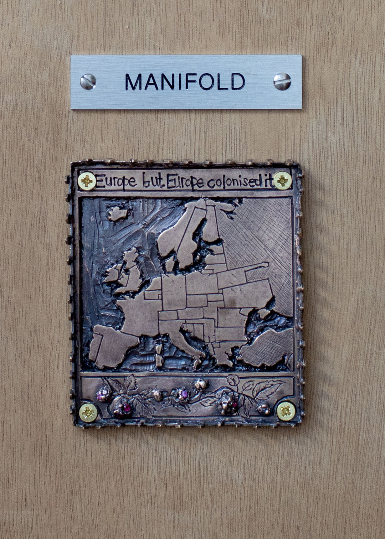 Onderschrift beeld: Clem Edwards. Europe but Europe Colonised it (doorplate). 2025. Brons, synthetische robijnen. Foto: A. (Nastija) Kiake.